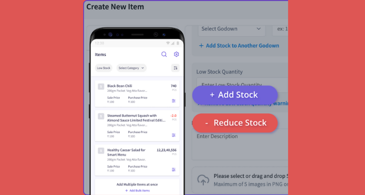 Track your stock and update automatically every time you add an item, generate a sales or purchase invoice. You can also quickly add items from our inbuilt library of more than 1 lakh products, add/edit items in bulk, set low stock alerts and much more.