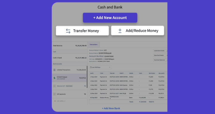 With this feature, you can manage cash registers, record payments received to your bank accounts from your customers, transfer money between bank accounts, view detailed account statements and track payments across different payment modes.