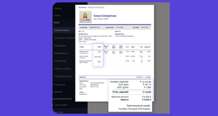 Create format based and professional invoices complying to government mandates within seconds. Essential details like party GSTIN, HSN/SAC details and tax components will be auto-populated basis the goods/services from your inventory. You can also generate credit and debit notes, delivery challan, sales and purchase returns.
